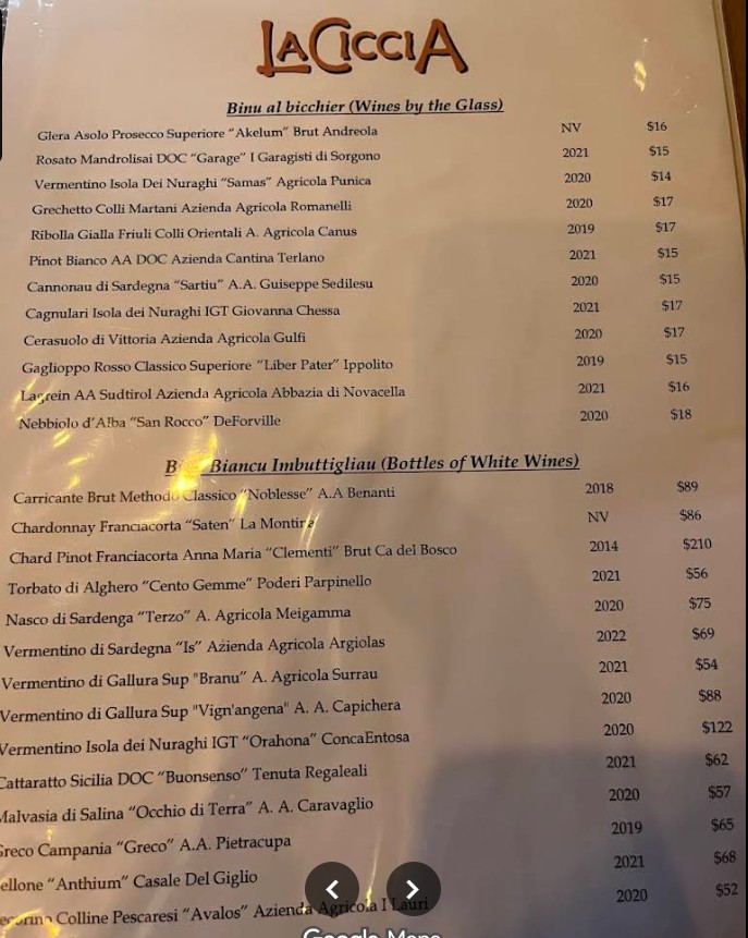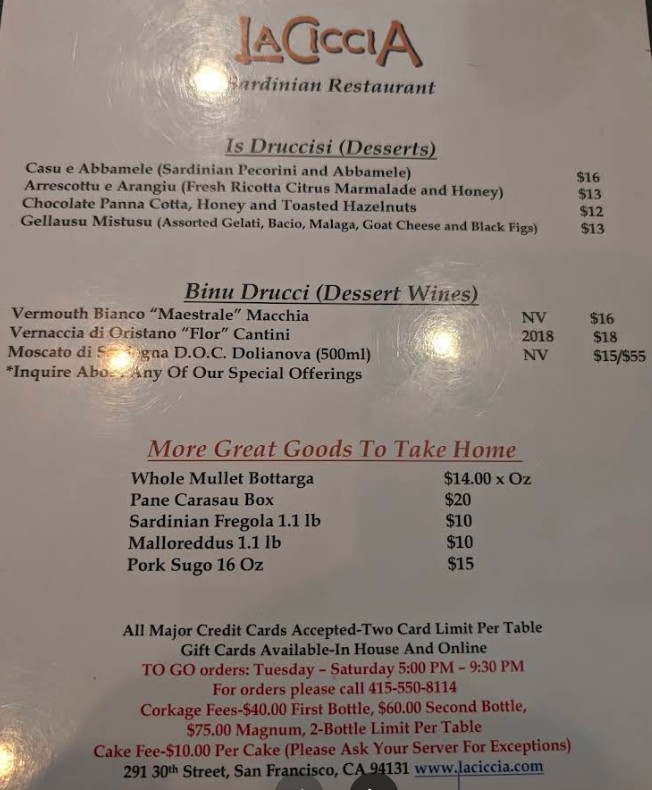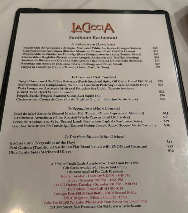 At La Ciccia, we invite you to savor the best of Sardinian cuisine, featuring authentic homemade pasta, delicious octopus stew, and other traditional dishes. Whether you're here for a casual meal or a special occasion, our menu, inspired by the rich flavors of Sardinia, promises a unique dining experience. With an exceptional selection of wines to pair with every meal, we are committed to providing you with a memorable dining experience in the heart of San Francisco.
